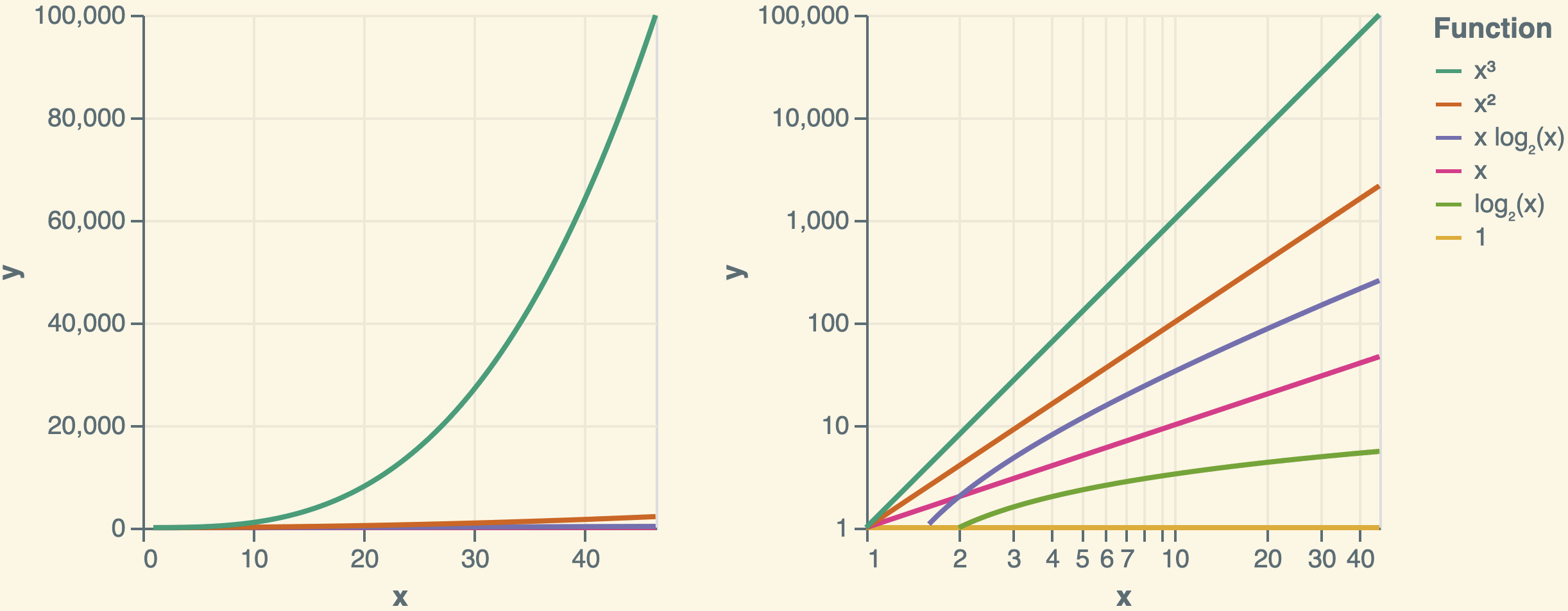The plots below illustrate functions commonly encountered in running-time analysis. The left plot uses linear scales for both the \(x\)-axis and \(y\)-axis, whereas the right plot employs logarithmic scales.