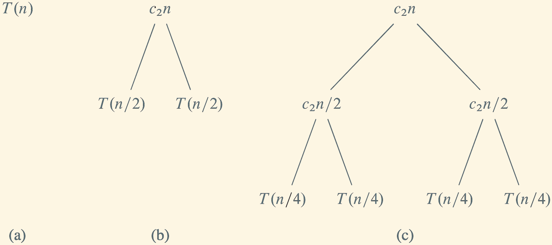 Next, we will represent the recurrence relation as a tree and derive \(T(n)\) from it.