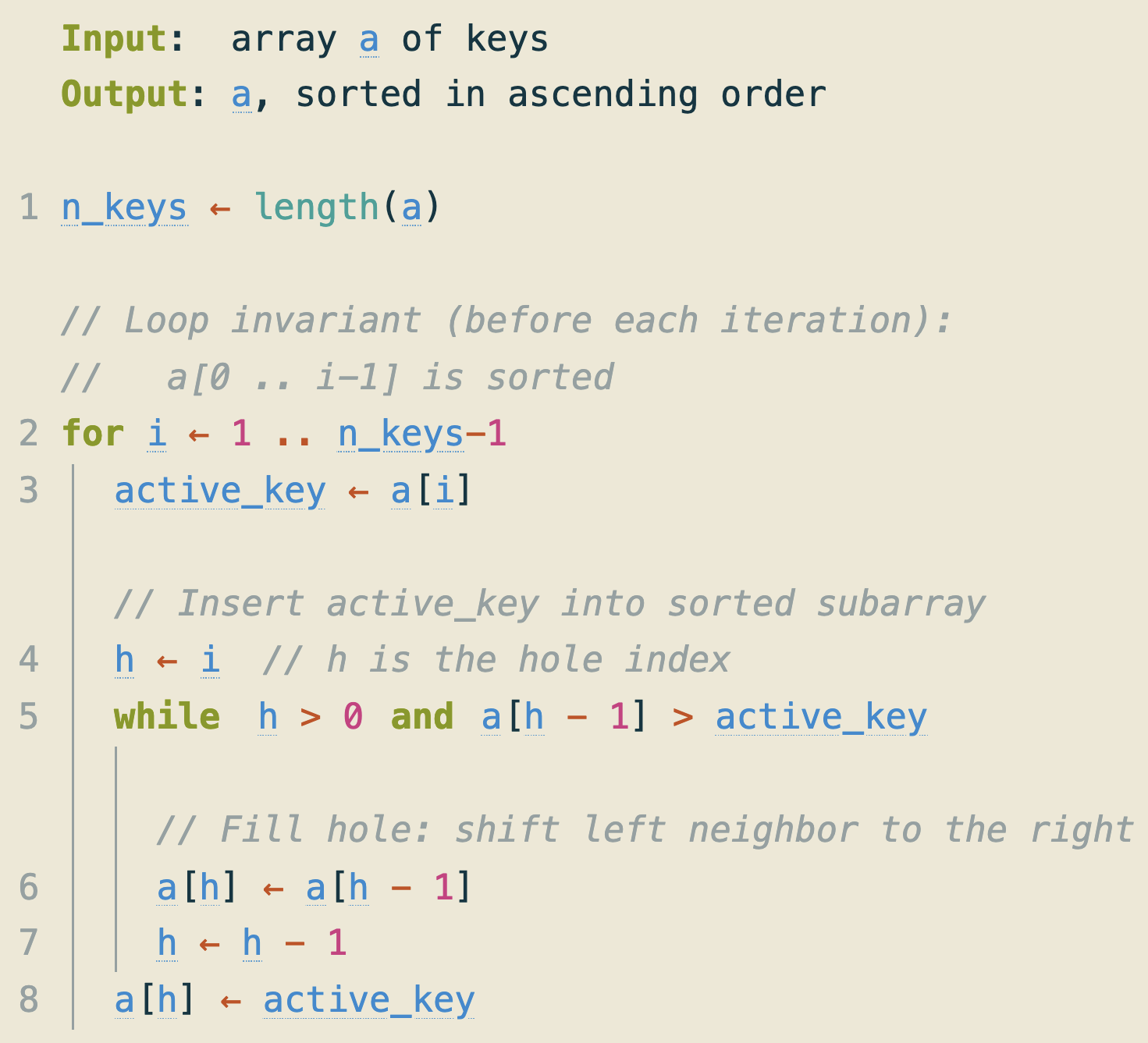 If a is in ascending order, then the while condition in line 5 fails immediately because a[h - 1] > active_key is false. Thus, no right shifts (line 6) are ever performed.