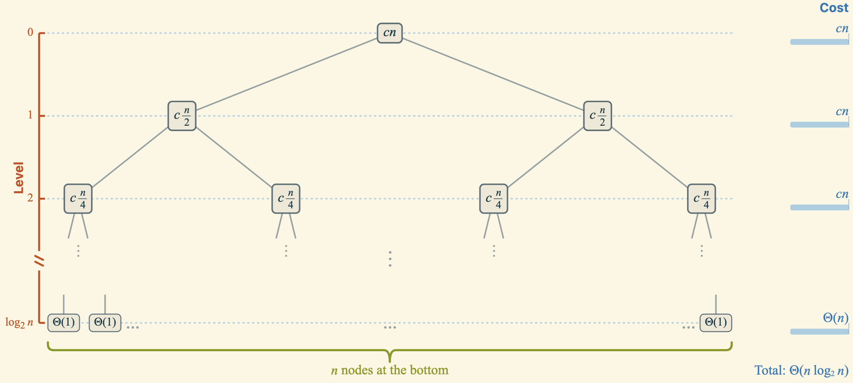 The cost of the bottom level is \(\Theta(1) \cdot n = \Theta(n)\), which is negligible compared to the combined cost of the non-leaf levels. We conclude that the running time of merge sort is \(\boldsymbol{\Theta(n \log n)}\).